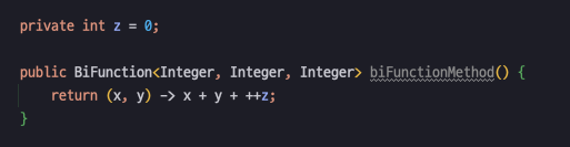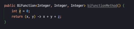 BiFunction<Integer, Integer, Integer> function = (x, y) -> x + y + z;