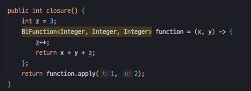 BiFunction<Integer, Integer, Integer> function = (x, y) -> x + y + z;